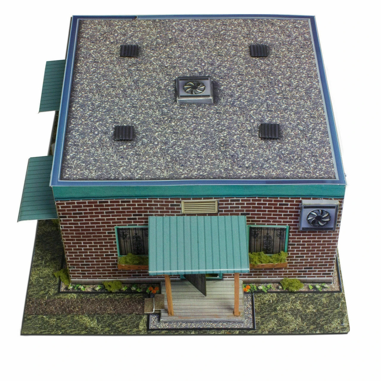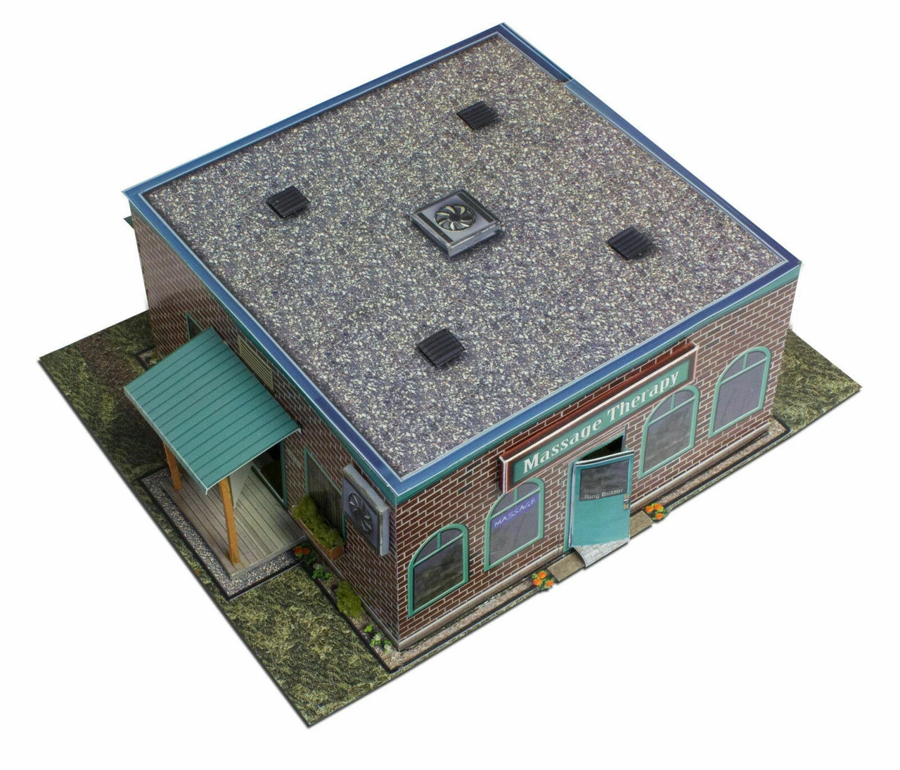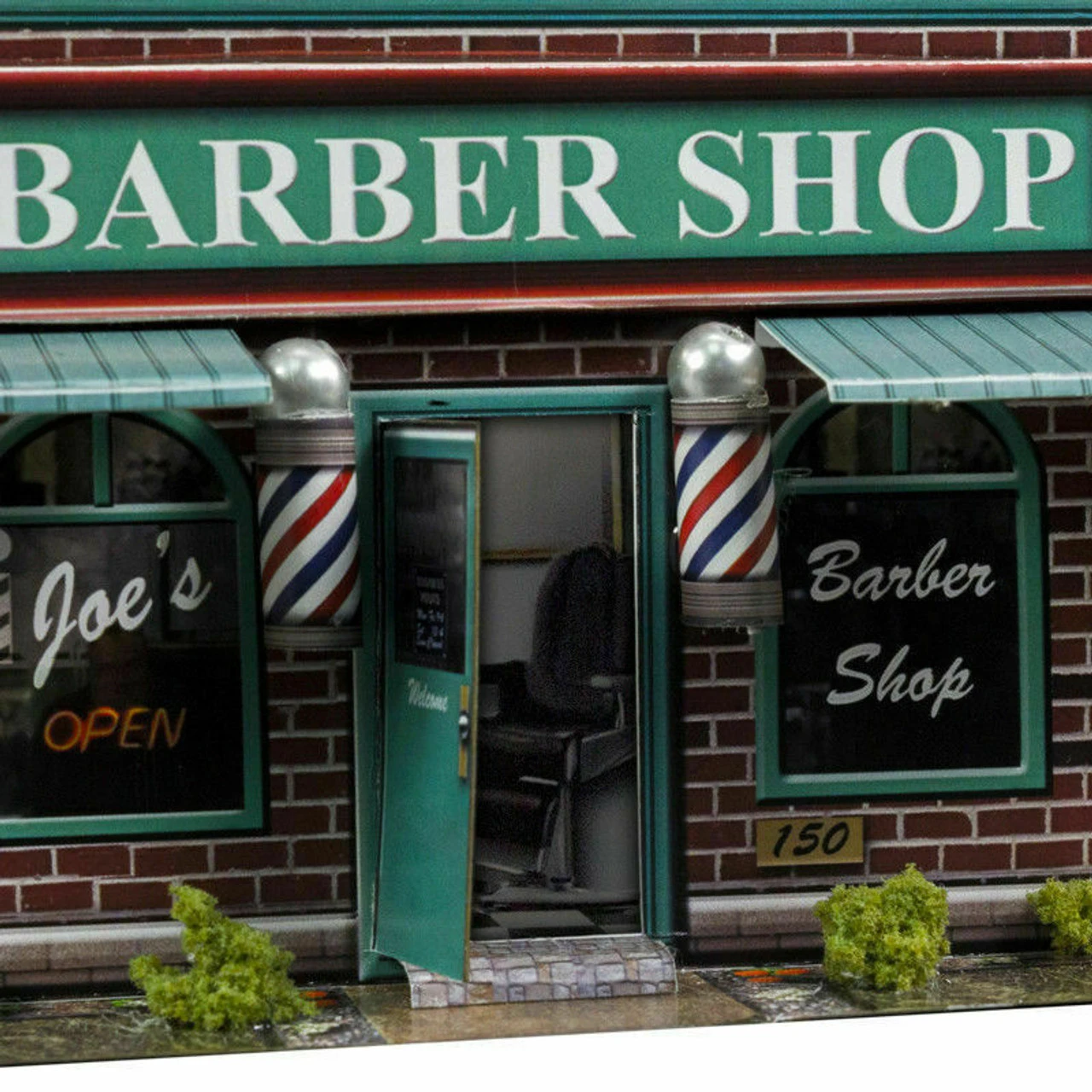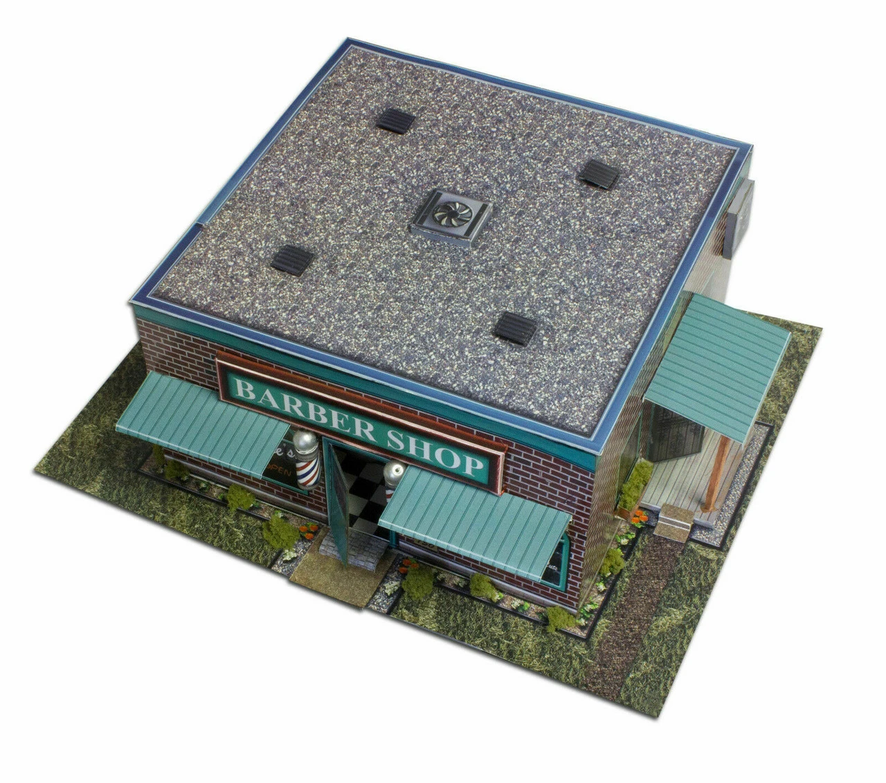 This Barber Shop kit features: burnt grass, signposts, Photo Real illusion rooms, air vent fans, barber poles, model base, and more!