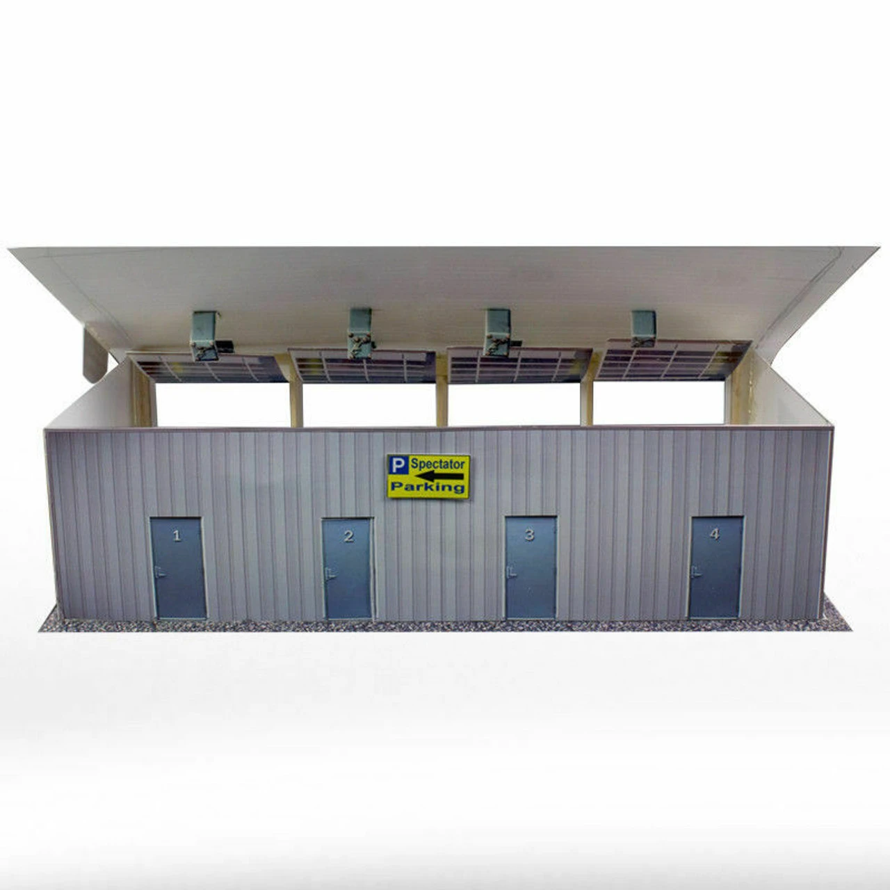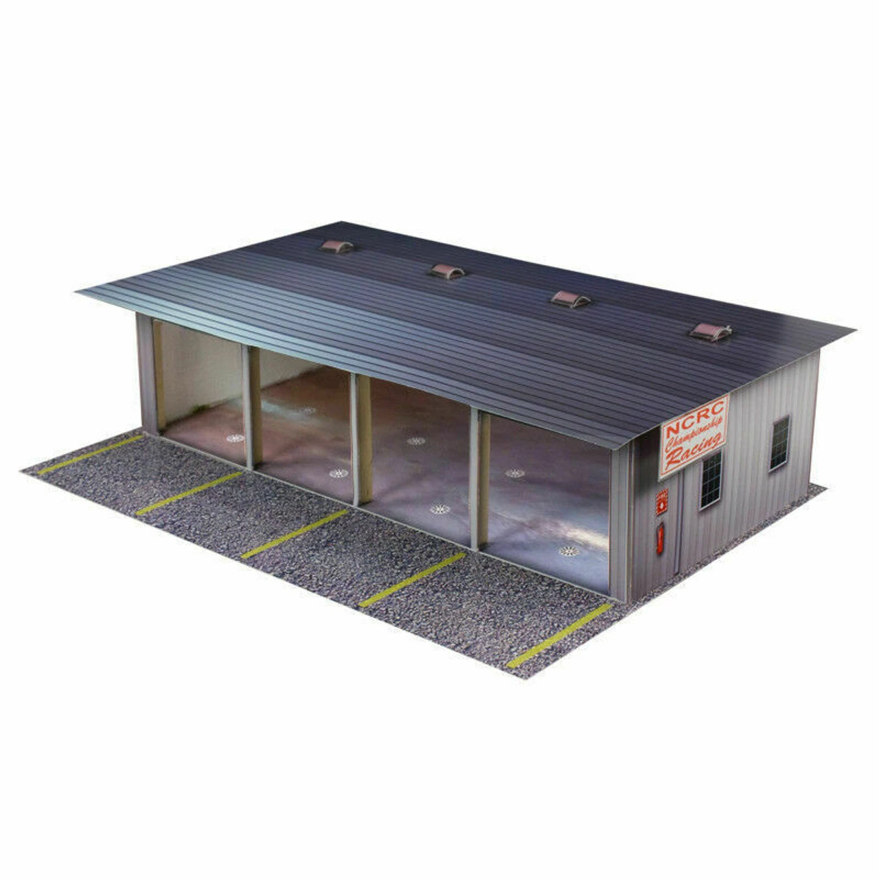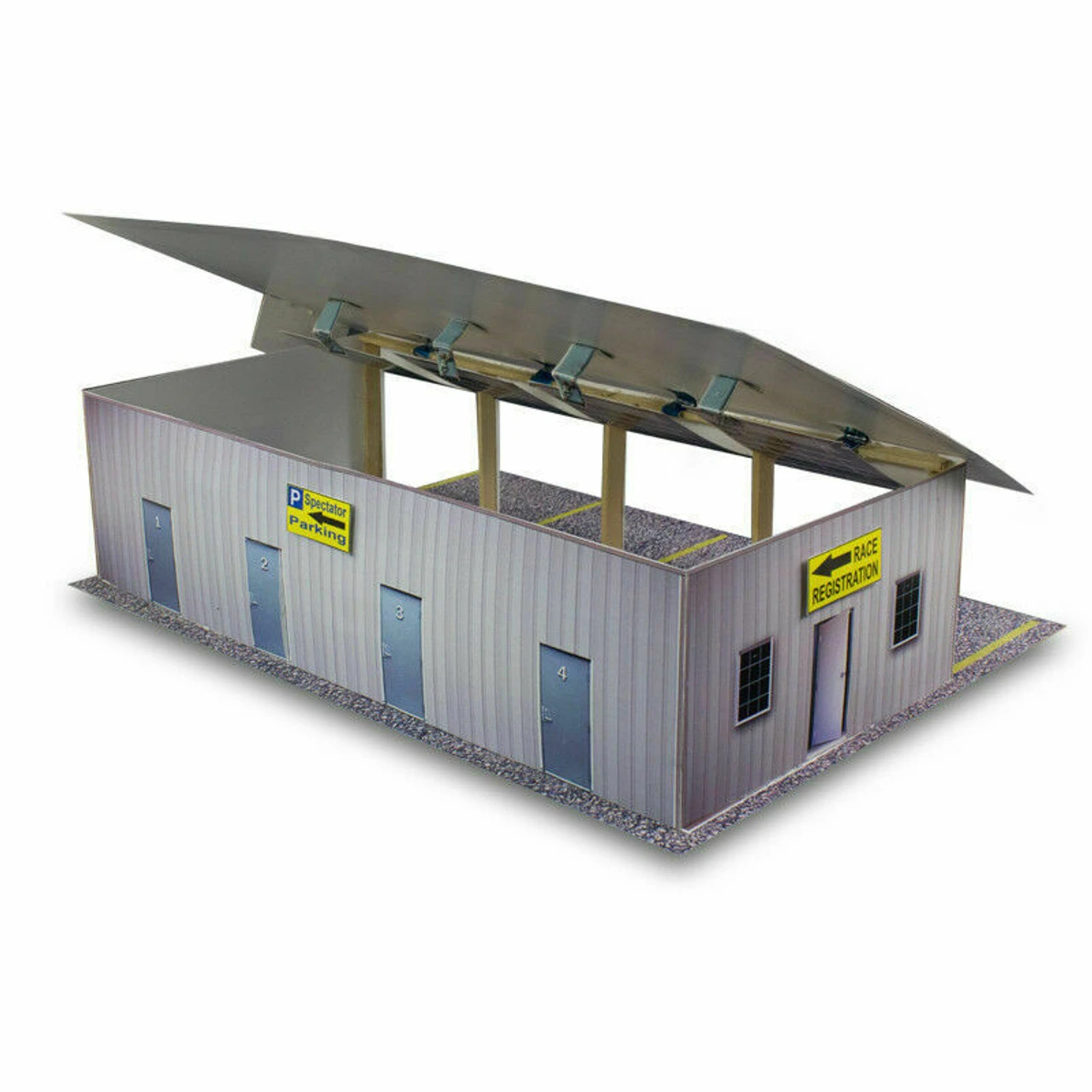 This Pit Garage kit features: burnt grass, bonus signage, model base, and more!