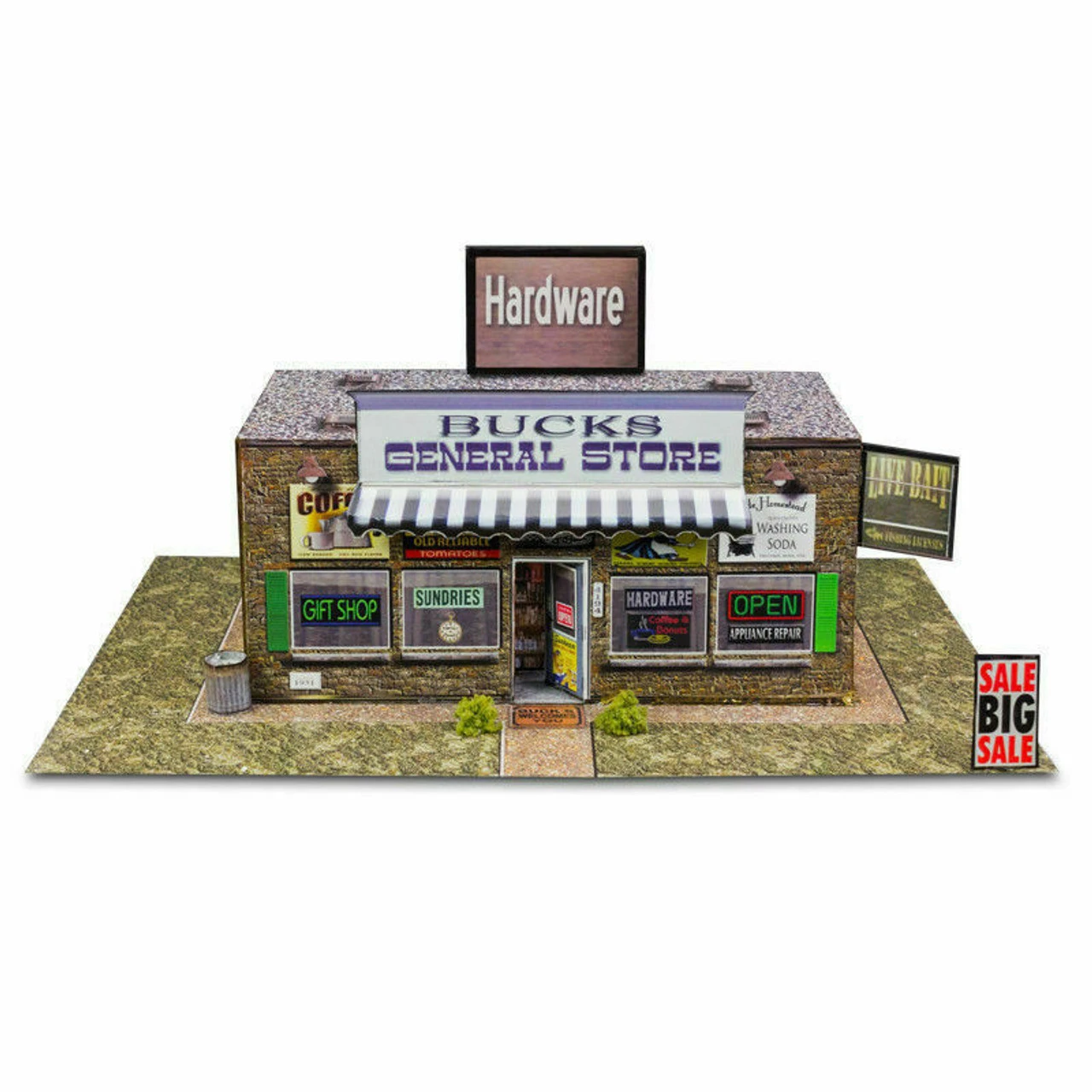 This General Store kit features: burnt grass, signposts, Photo Real illusion rooms, air vent fans, bonus signs, awnings, model base, and more!