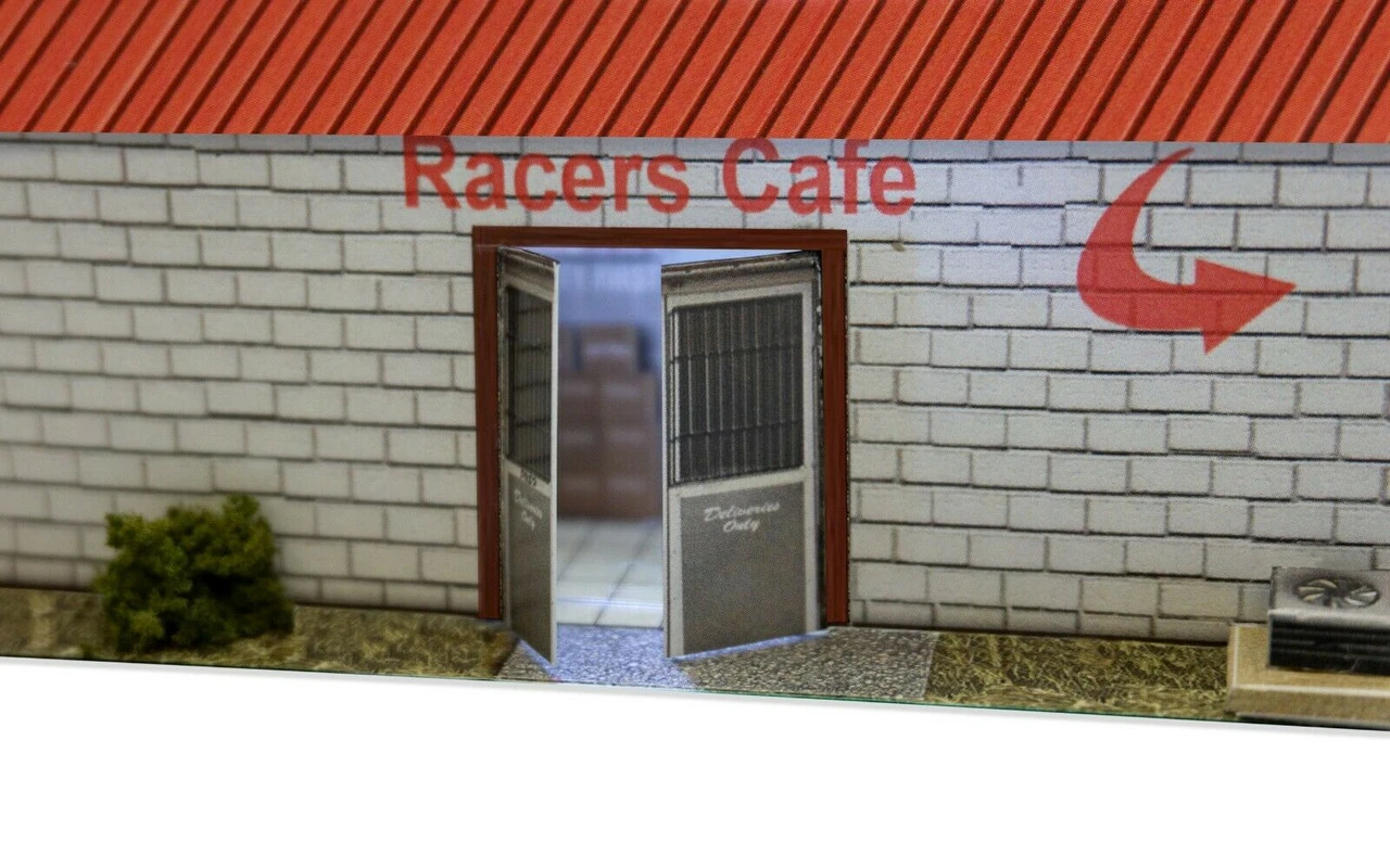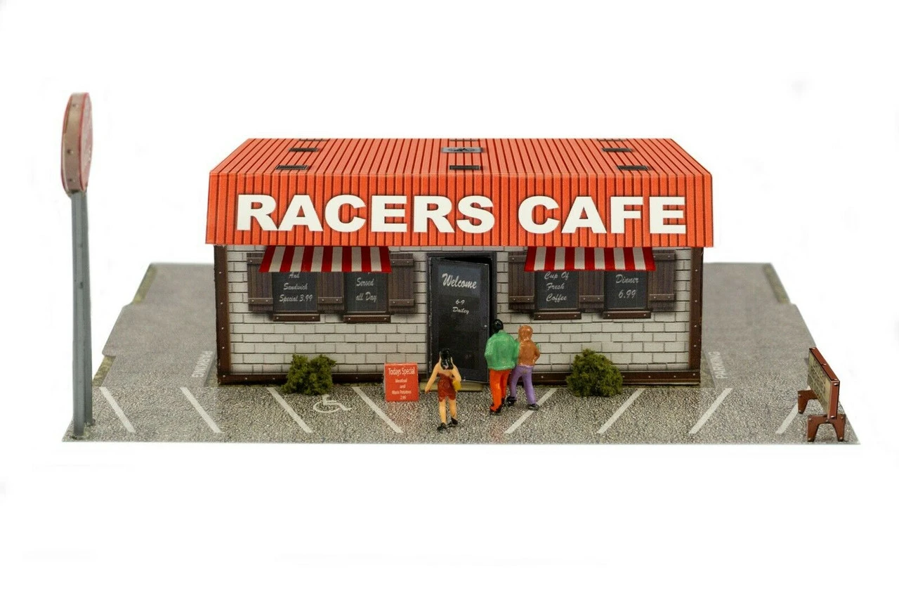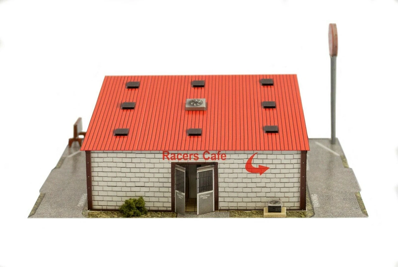 This Raceway Cafe kit features: opening doors, photo real cafe interior illusion rooms, roadside cafe sign, awnings, model people, burnt grass, roof vents, and model base with interior flooring.