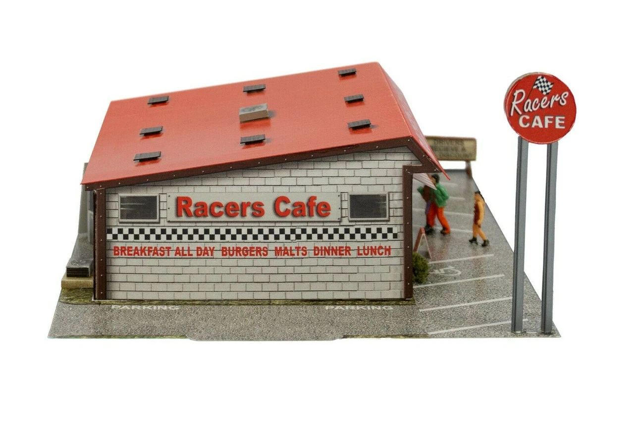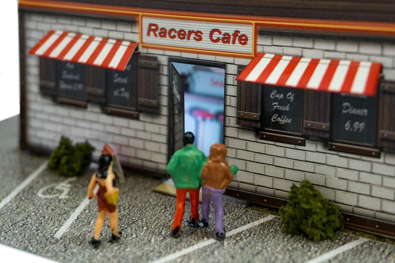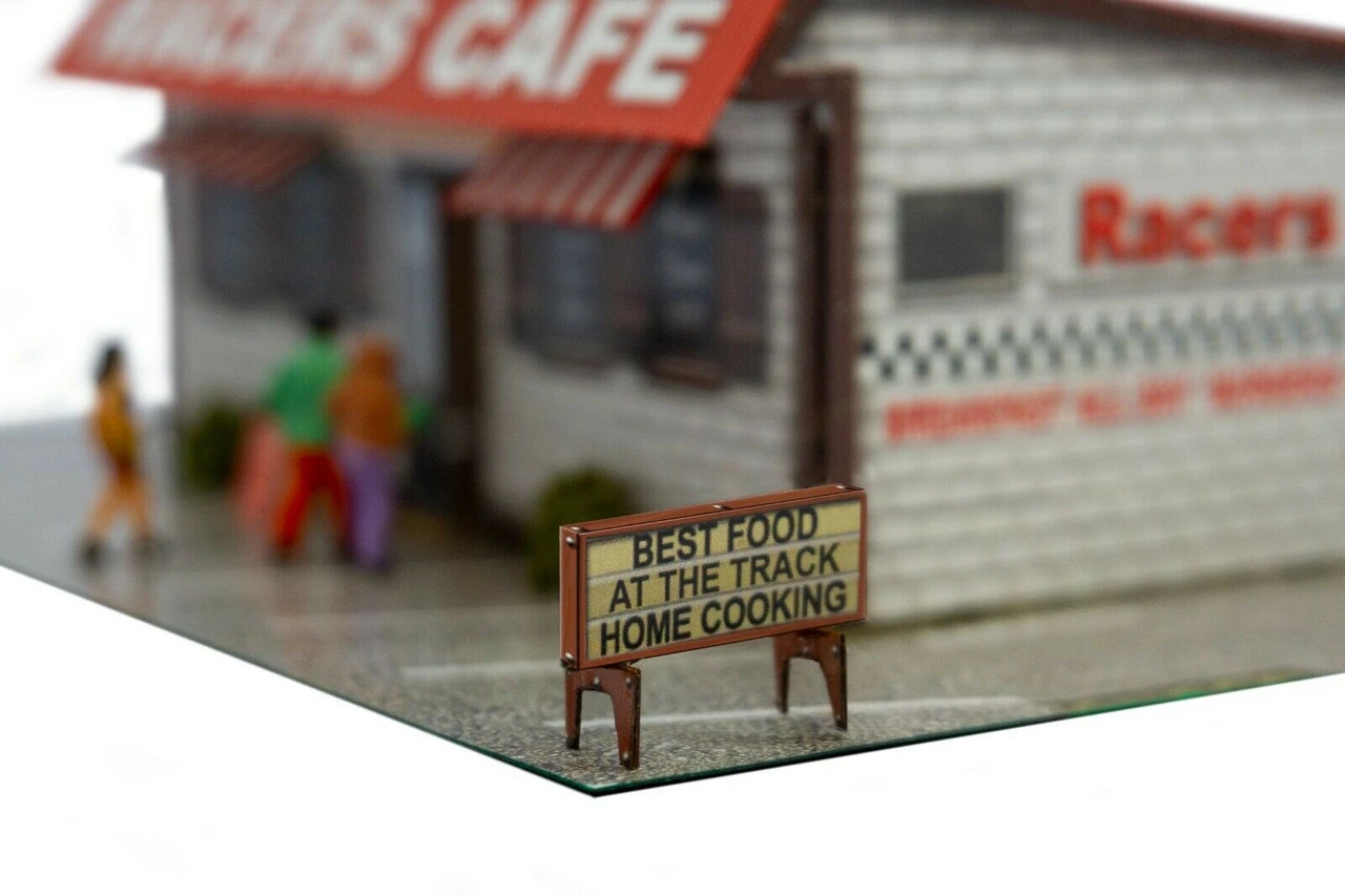 This Raceway Cafe kit features: opening doors, photo real cafe interior illusion rooms, roadside cafe sign, awnings, model people, burnt grass, roof vents, and model base with interior flooring.