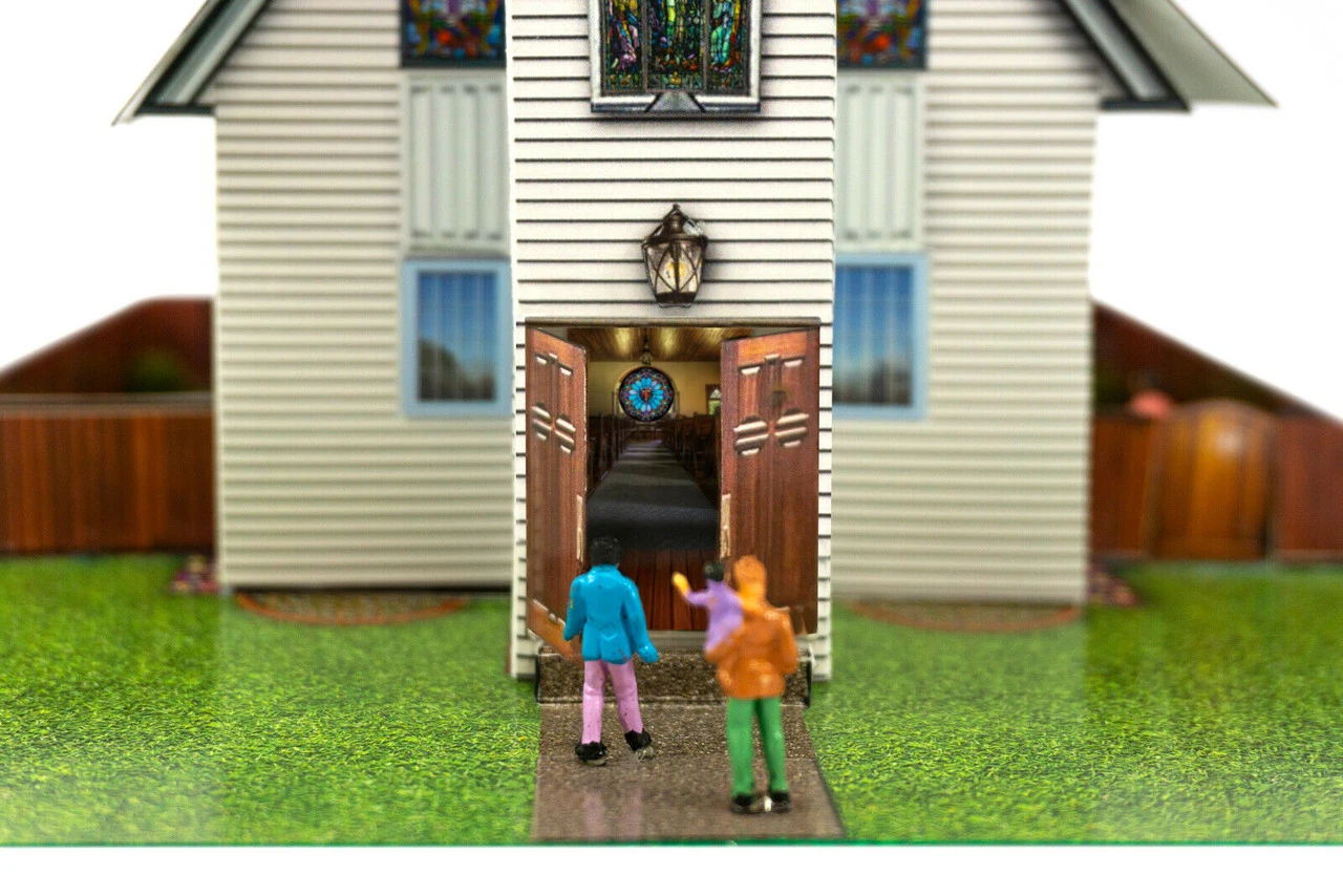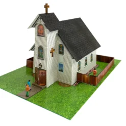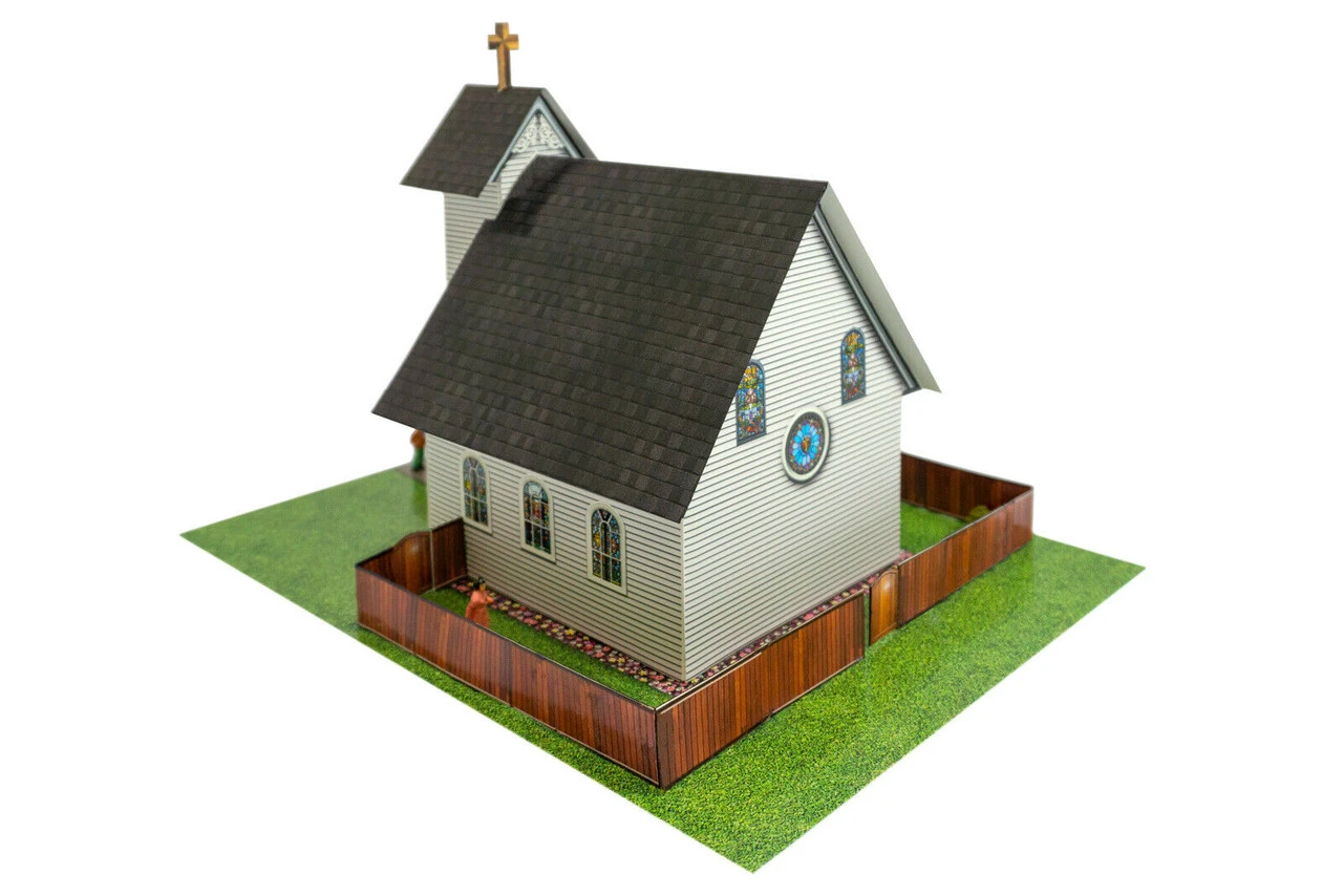This Church kit features: opening doors, model people, Photo Real wood fencing, burnt grass, church steeple, and model base with interior flooring, and more!