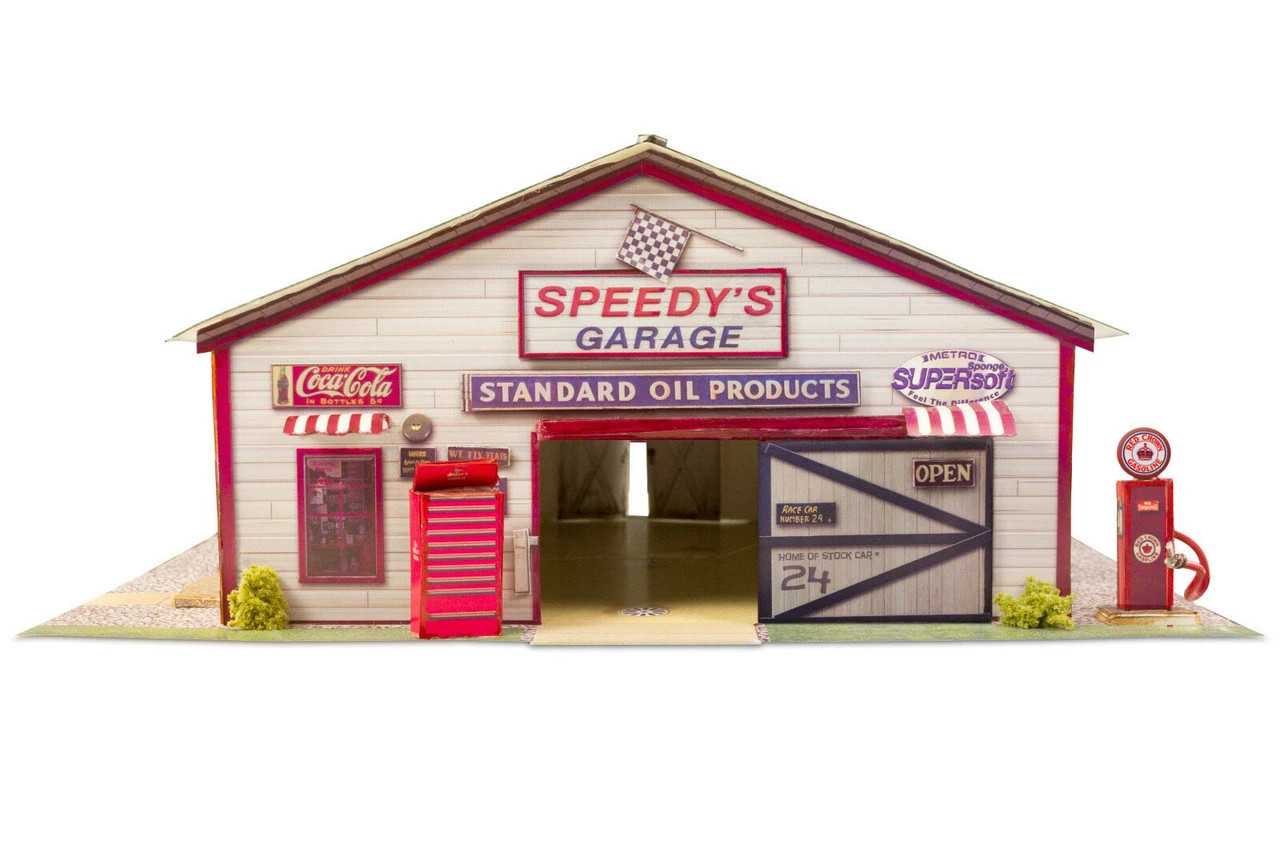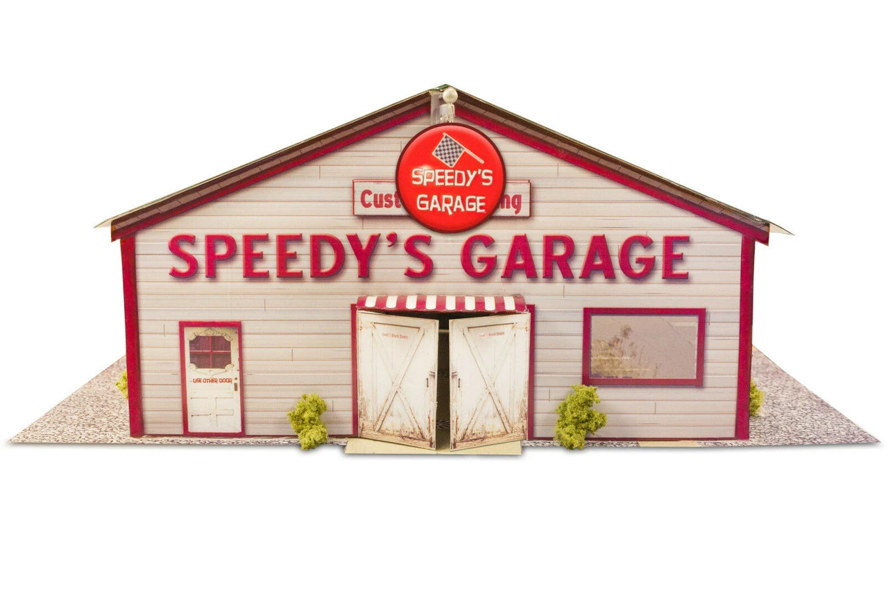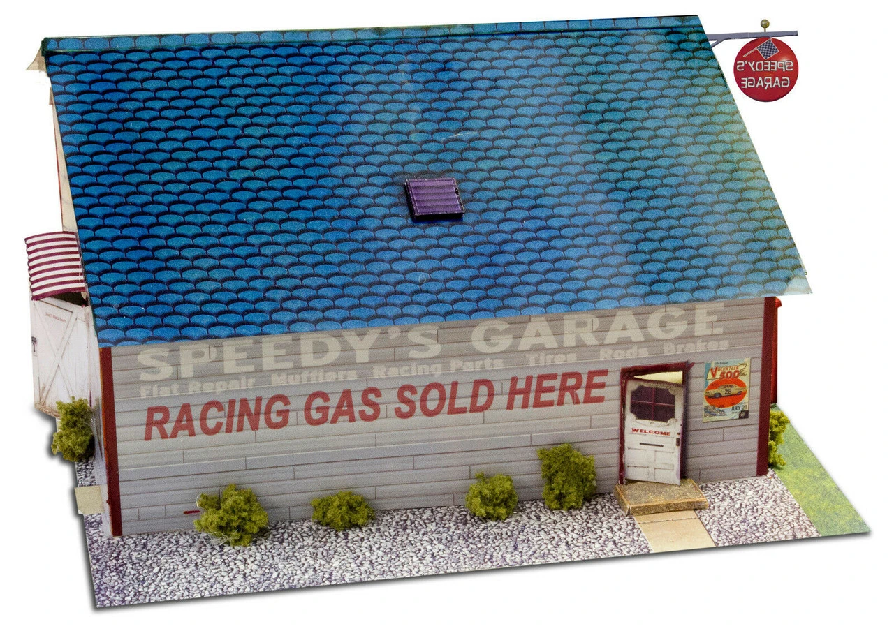 5 ea. Flexstock Model Sheets, small package of landscape clump moss that is enough to landscape this kit, 1 ea. hanging sign that swings freely from above the garage, 1 ea. gas pump hose for the gas pump, 2 ea. gas pump dome covers that goes over the gas pump top. Bonus large red tool box included in every Speedy’s Garage kit. Cars and track shown in photos are not included in this kit, sorry.