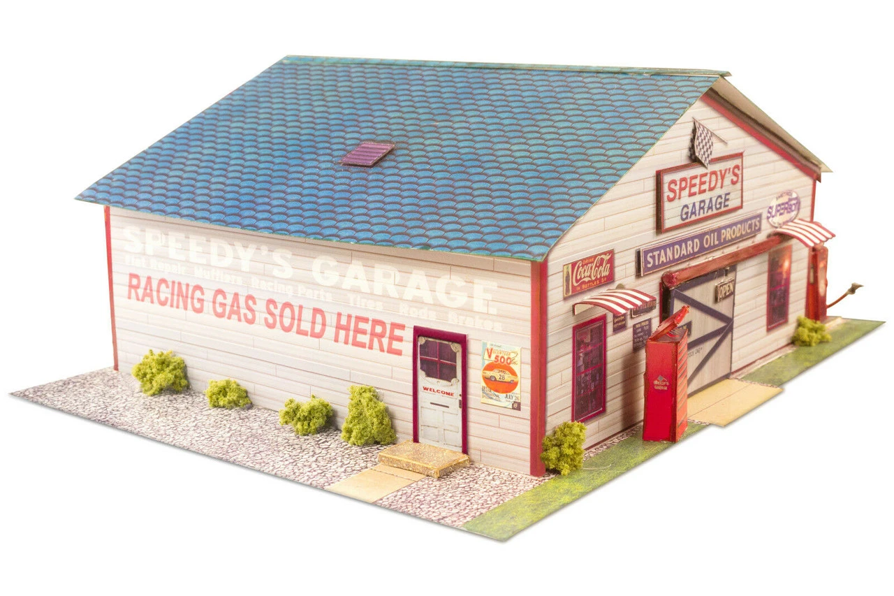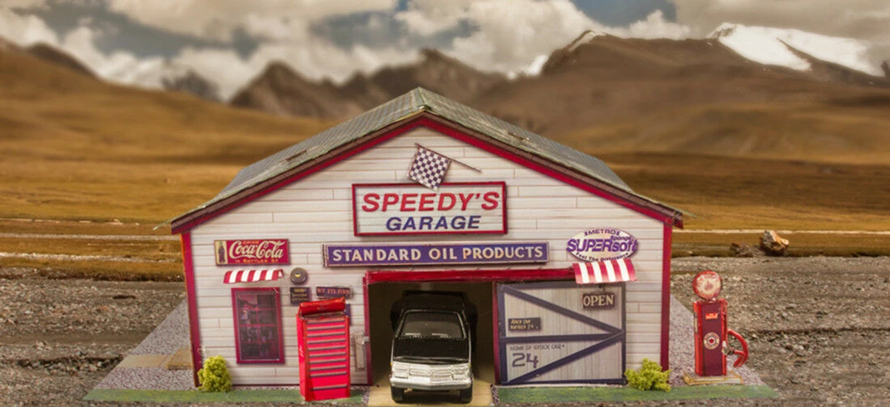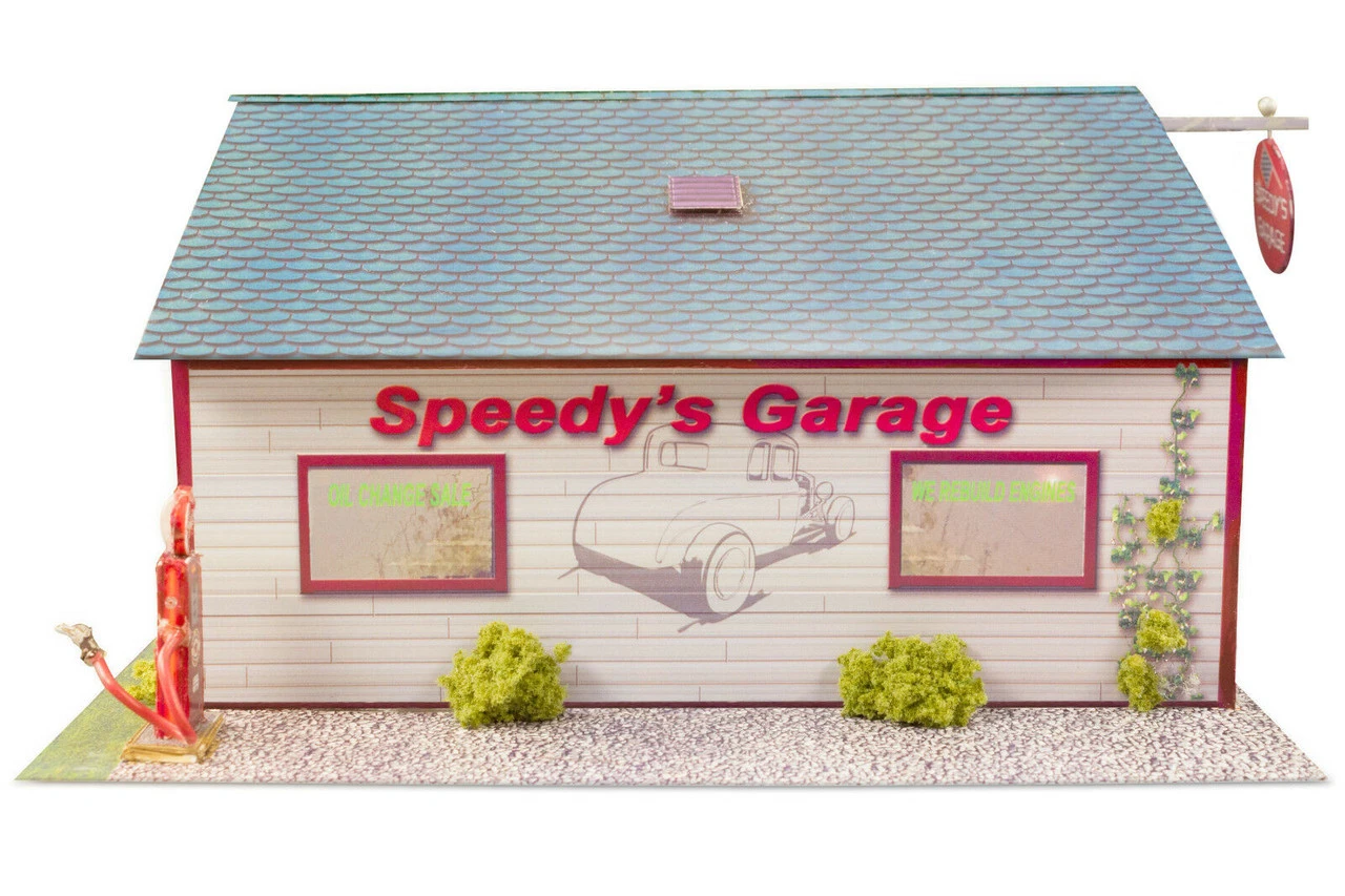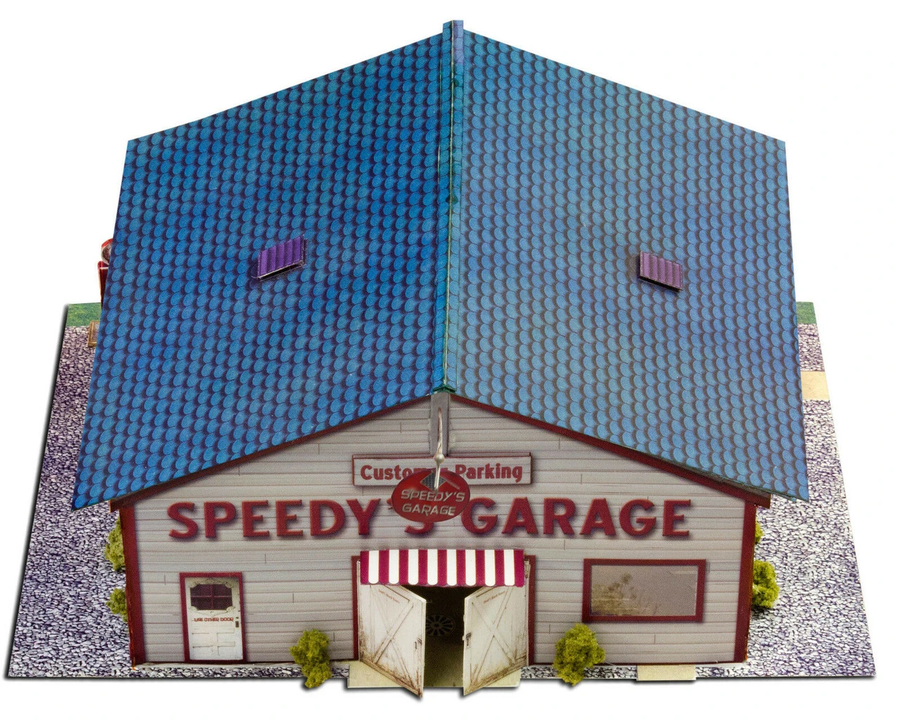 5 ea. Flexstock Model Sheets, small package of landscape clump moss that is enough to landscape this kit, 1 ea. hanging sign that swings freely from above the garage, 1 ea. gas pump hose for the gas pump, 2 ea. gas pump dome covers that goes over the gas pump top. Bonus large red tool box included in every Speedy’s Garage kit. Cars and track shown in photos are not included in this kit, sorry.