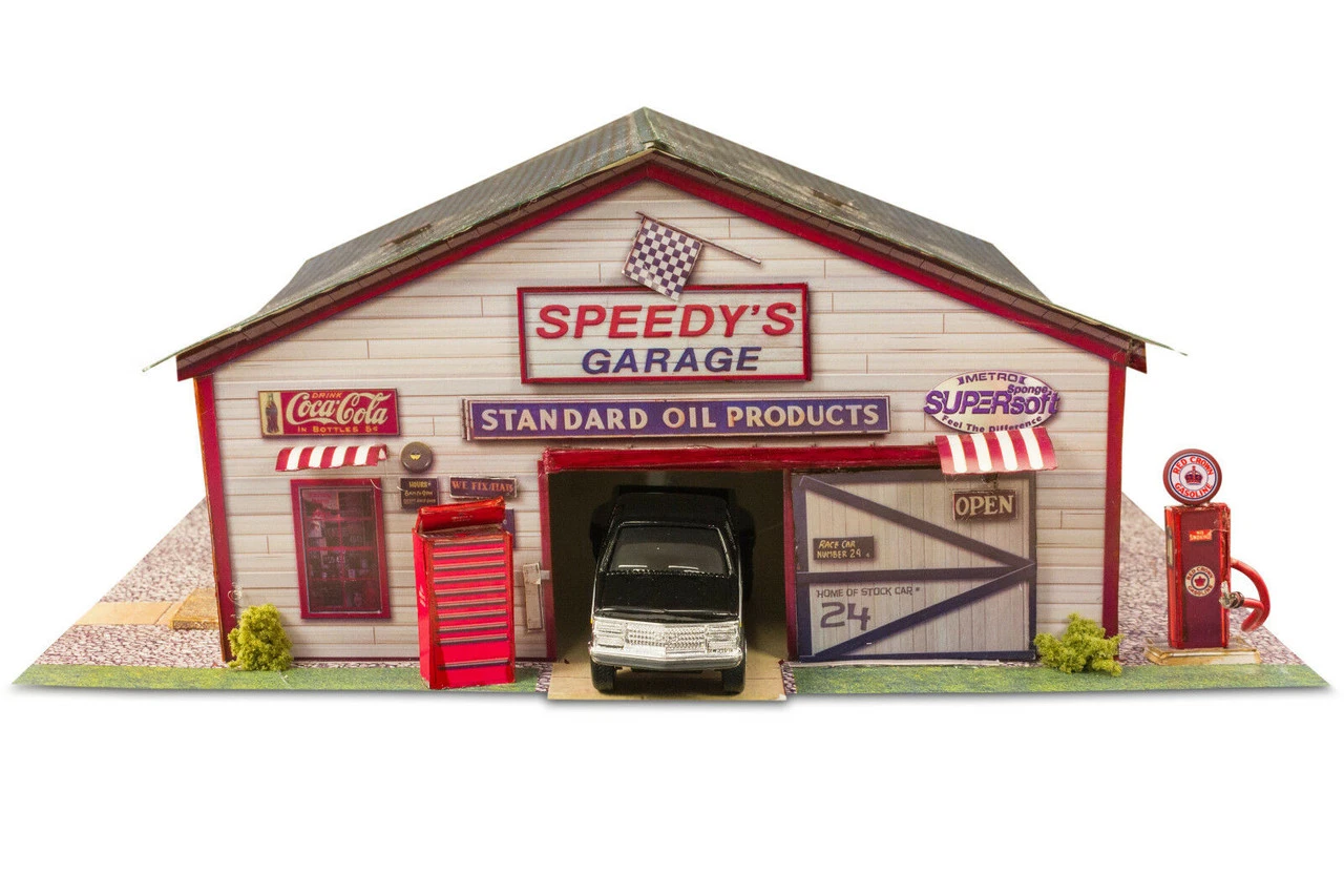This Garage features: 3D tool box, old fashion gas station pump, Photo real 3D awnings, authentic sliding garage door. The kit also includes the materials required to make the door slide open and shut. Hanging sign.