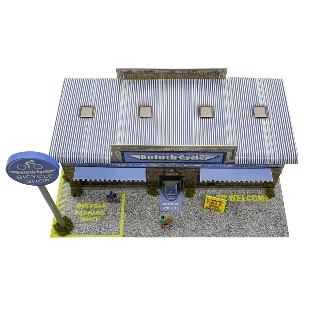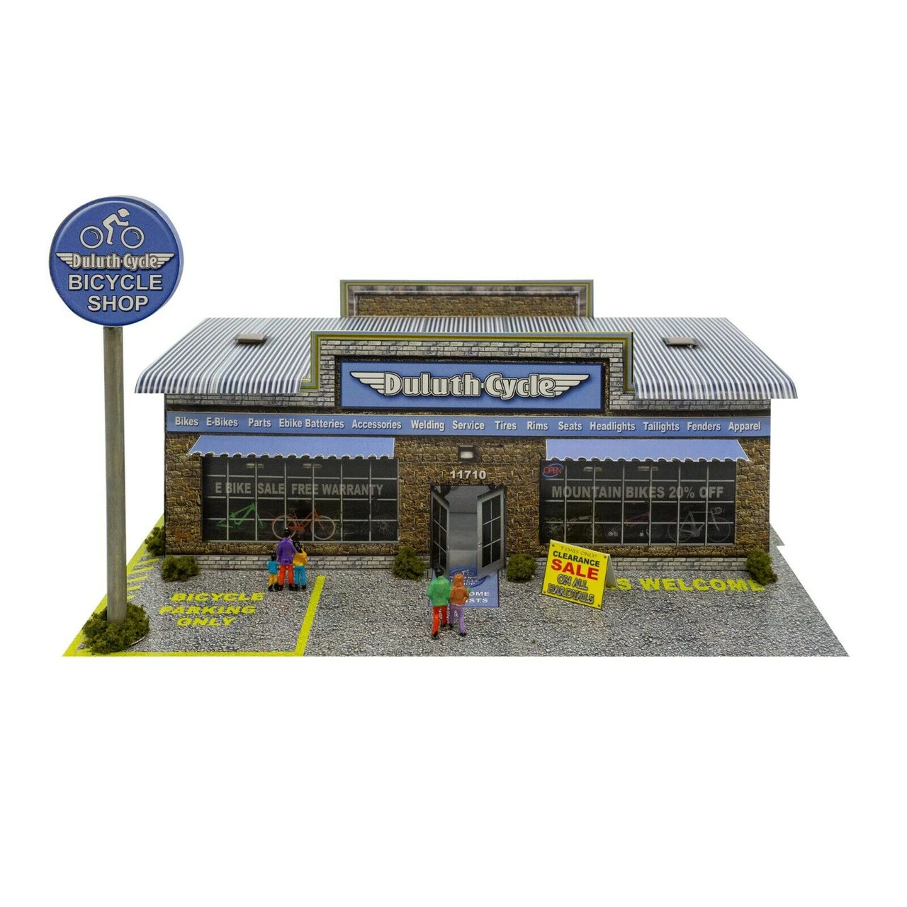 This Duluth Cycle kit features: opening doors, photo real illusion rooms, awnings, model people, burnt grass, removable roof, 3D roof vents, model sign, model base with interior flooring, and more!