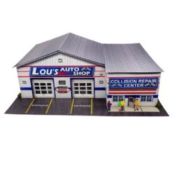 “Lou’s Auto Shop” Photo Real Scale Building Kit is a complete scale model set that comes ready to trim and assemble.