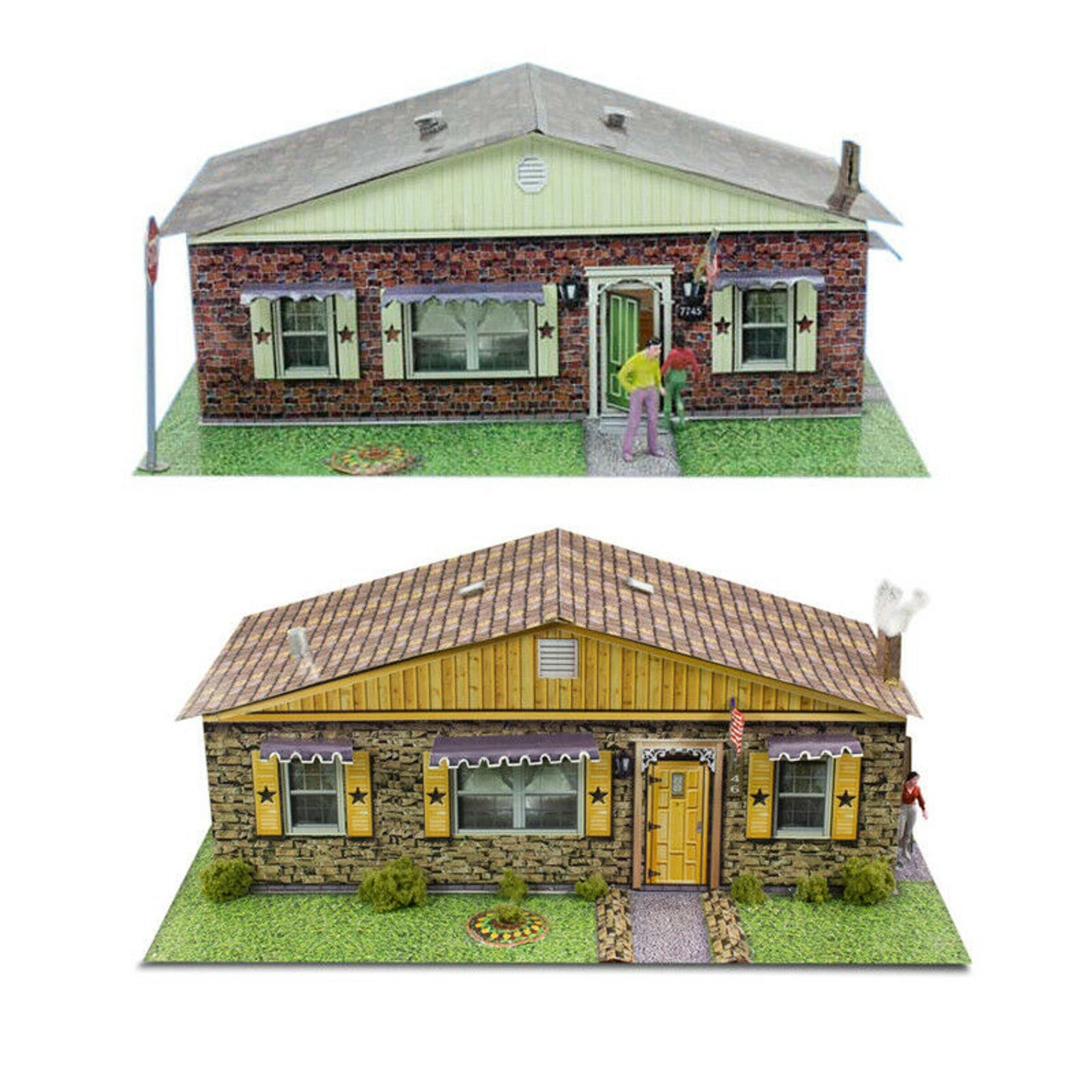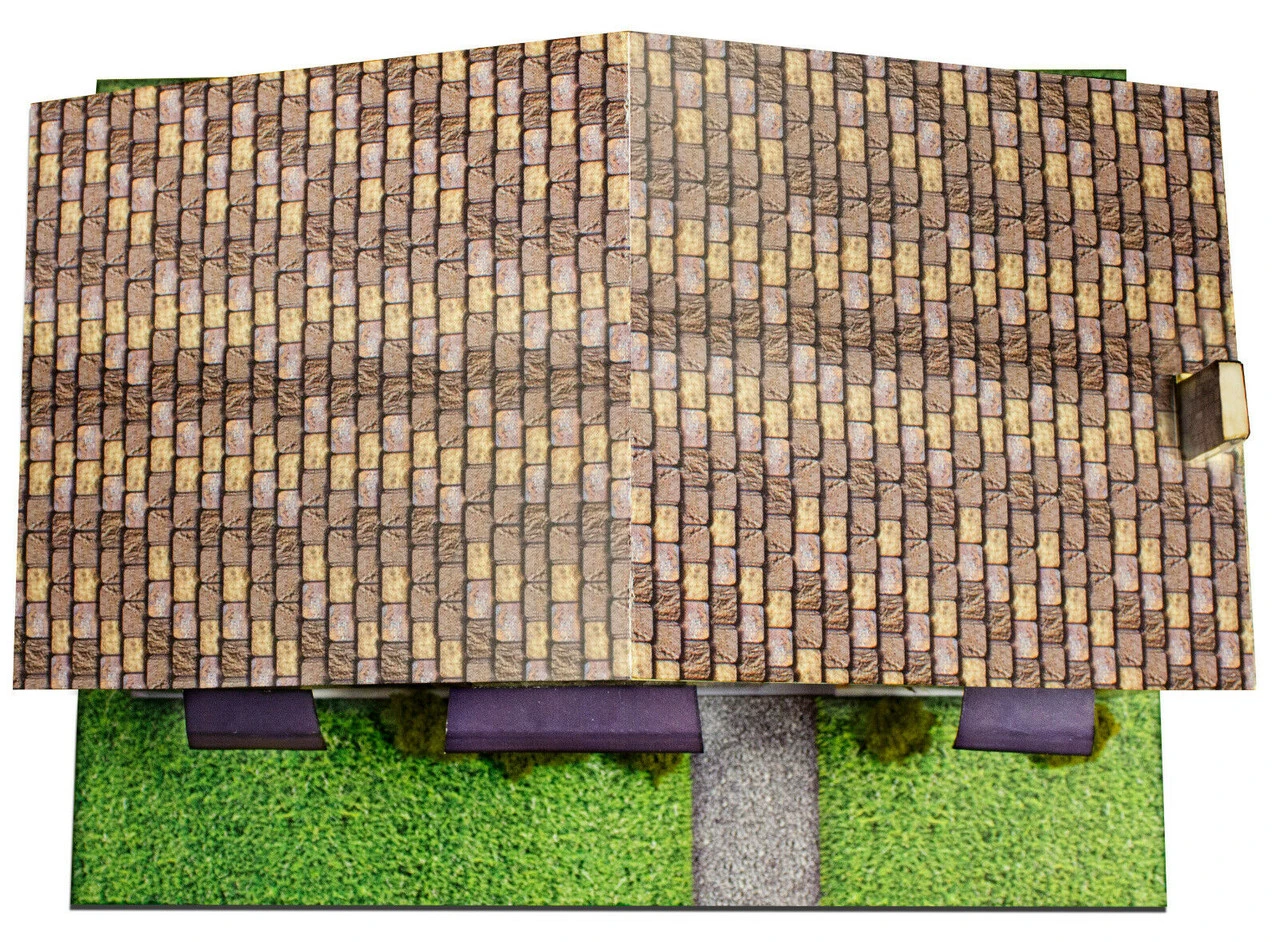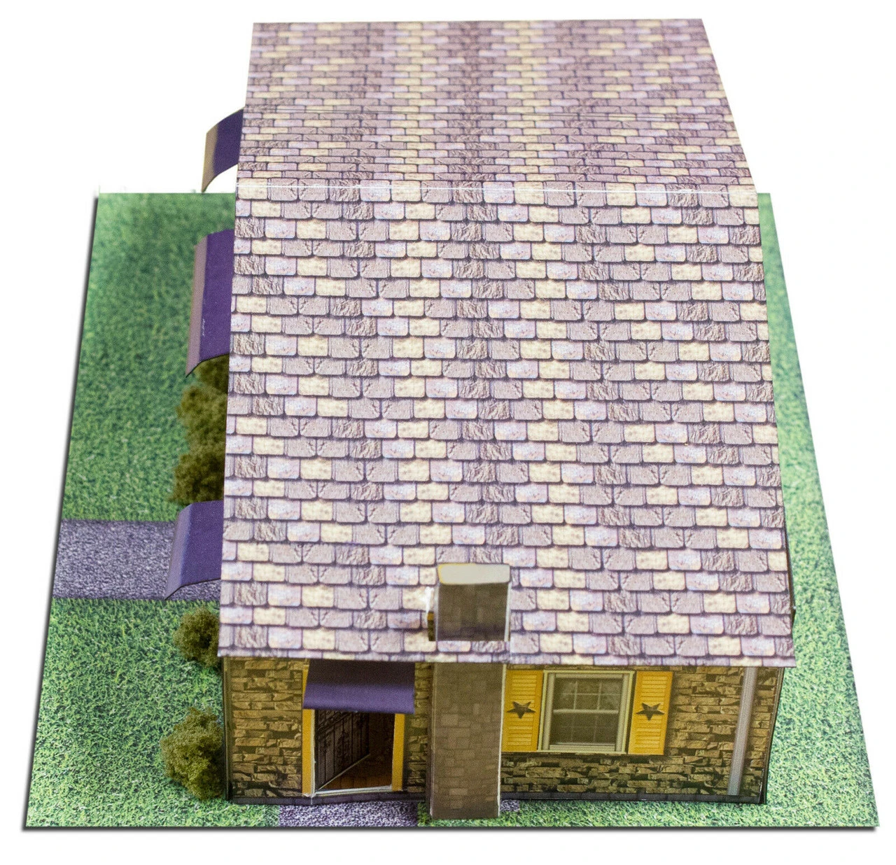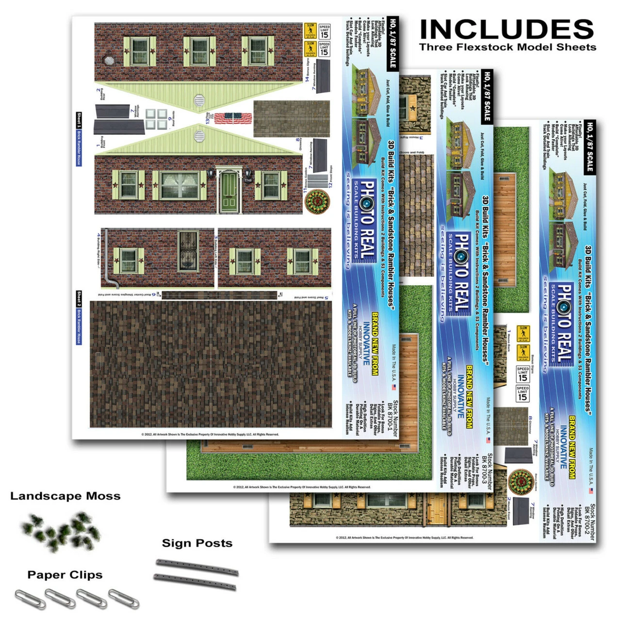 “Red Brick and Sandstone Rambler” Photo Real Scale Building Kit is a complete scale model set that comes ready to trim and assemble. This kit includes flags, a photo real 3D chimney, awnings, air vents, and more.