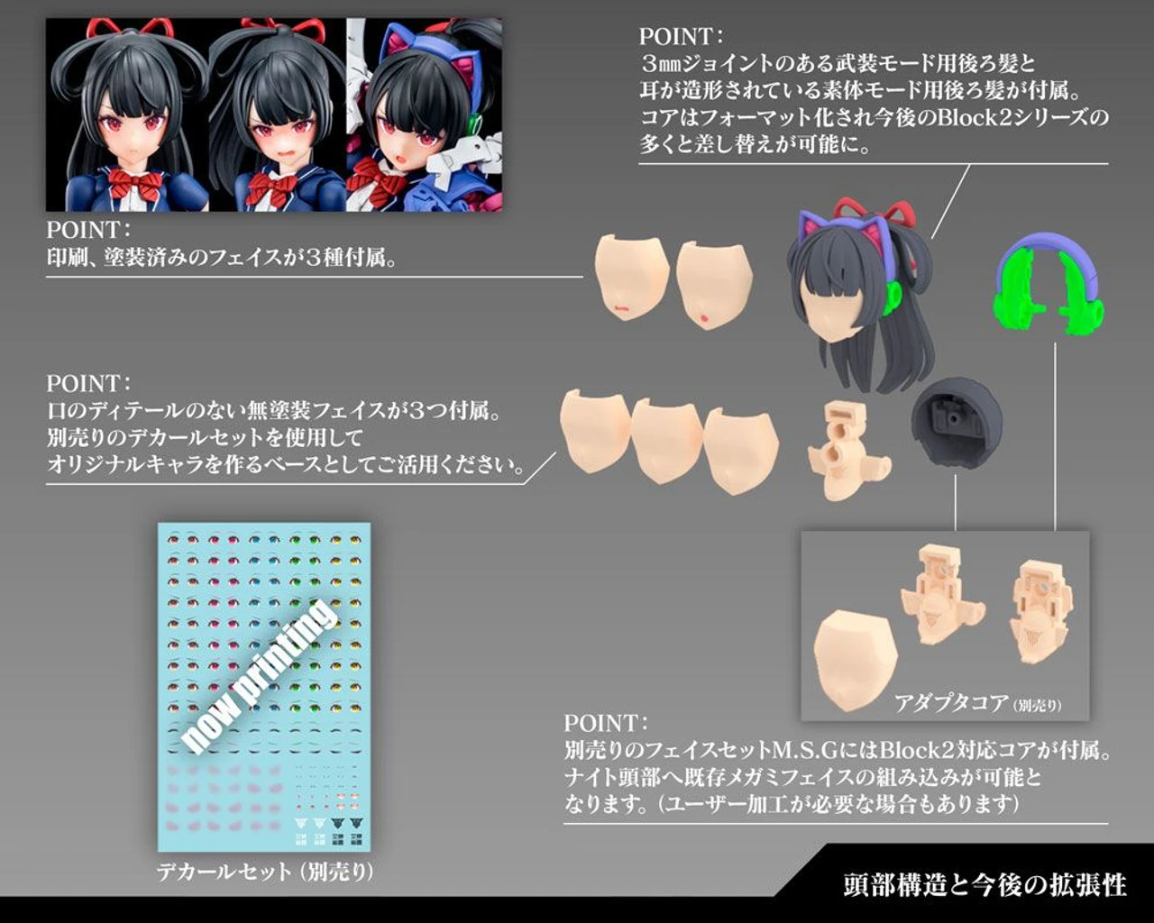 – The 3mm connection points on each part and head compatibility parts allow this model to be customized with existing M.S.G, Frame Arms, Frame Arms Girl, Hexa Gear, Sousai Shojo Teien, and Arcanadea series parts.