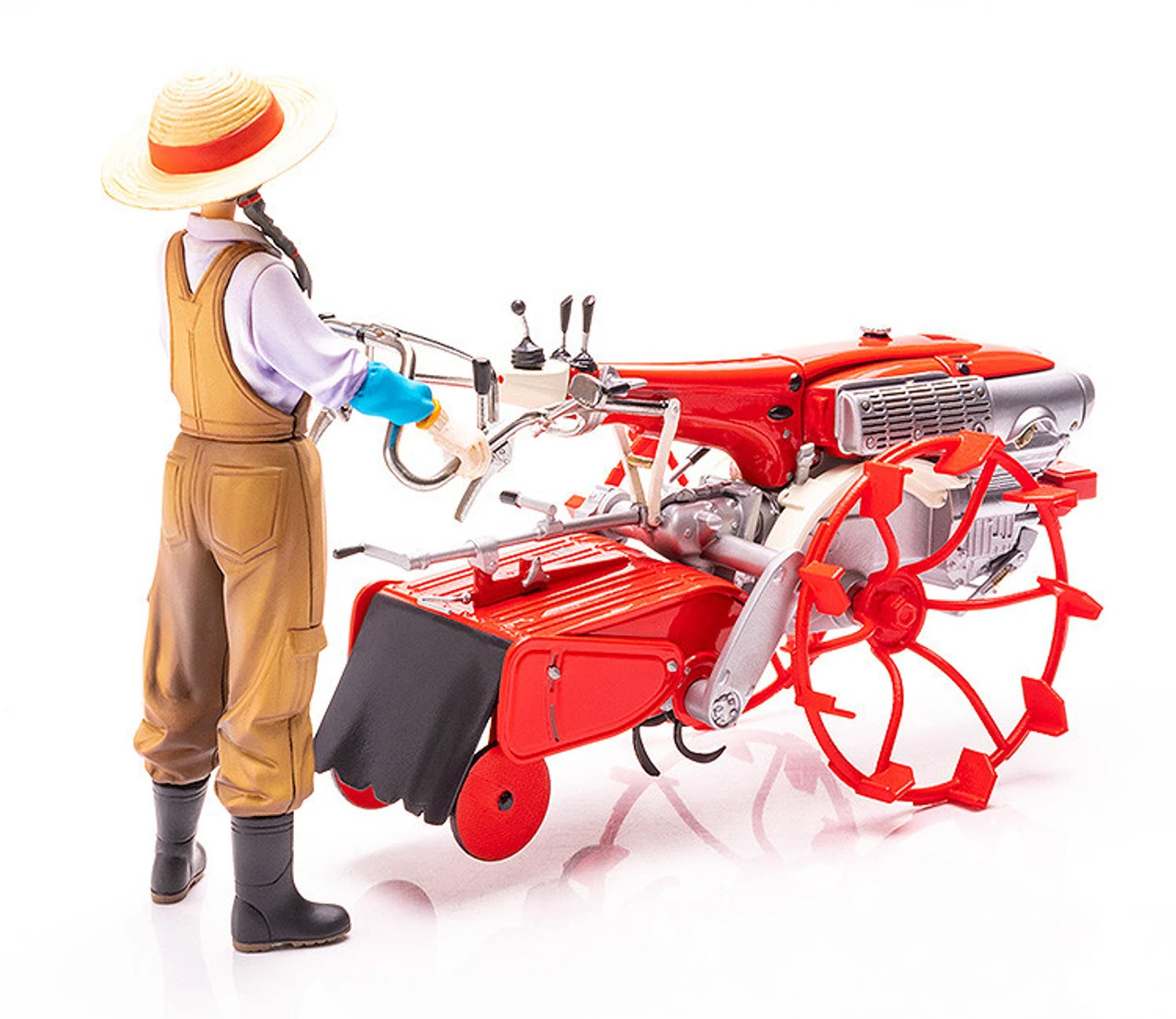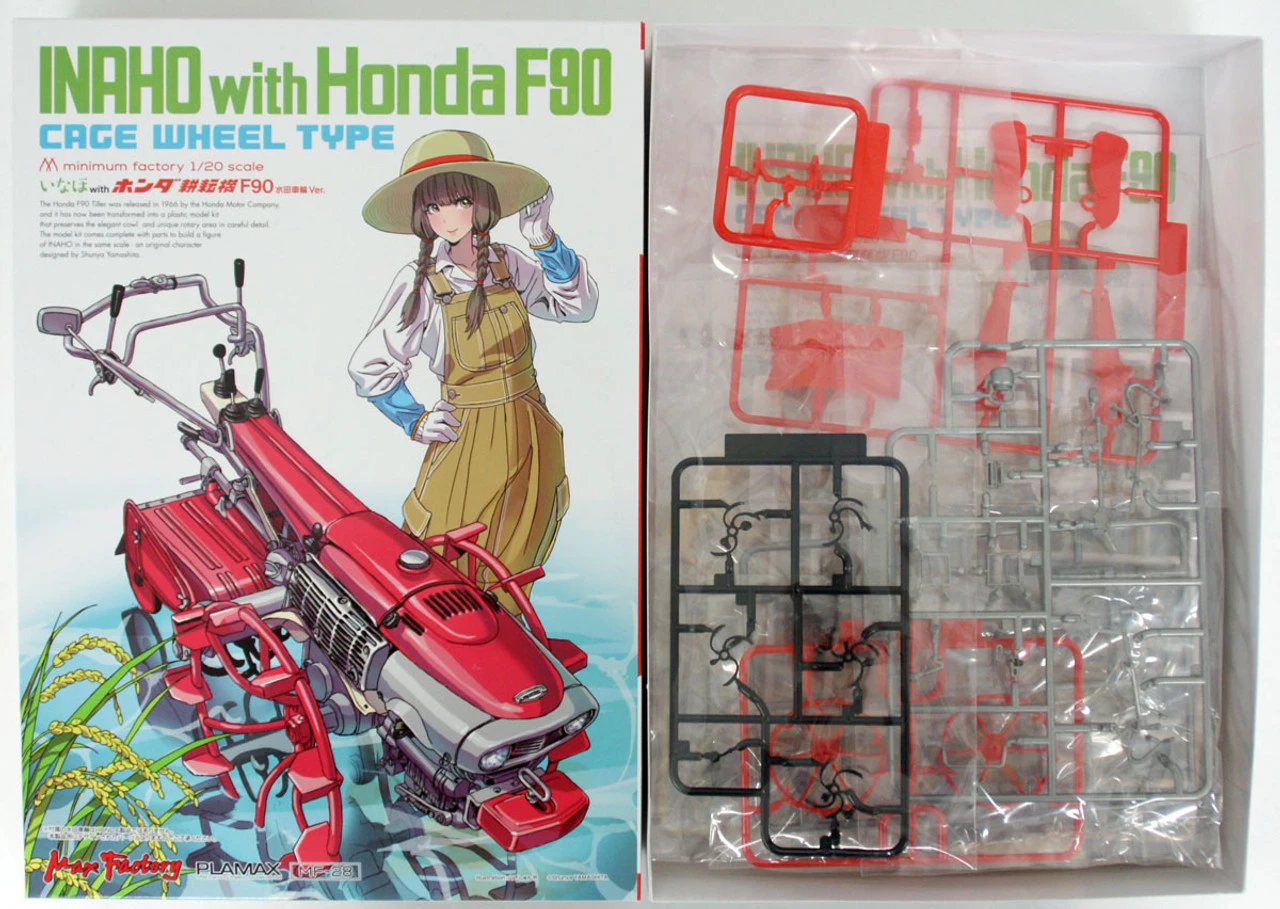 The Honda F90 Tiller, released in 1966 by the Honda Motor Company, has been transformed into a model kit now with special cage wheel optional parts. The model kit comes complete with parts to build a figure of Inaho in the same scale – an original character designed by Shunya Yamashita.