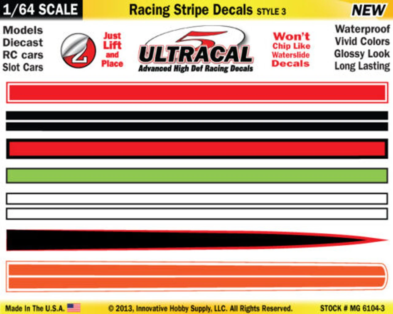 MG 6104-3 UltraCal Racing Stripe Decals Style 3 Red White Stripe 1:64 Scale -Innovative Hobby Supply shop UltraCal promo piece V5 General